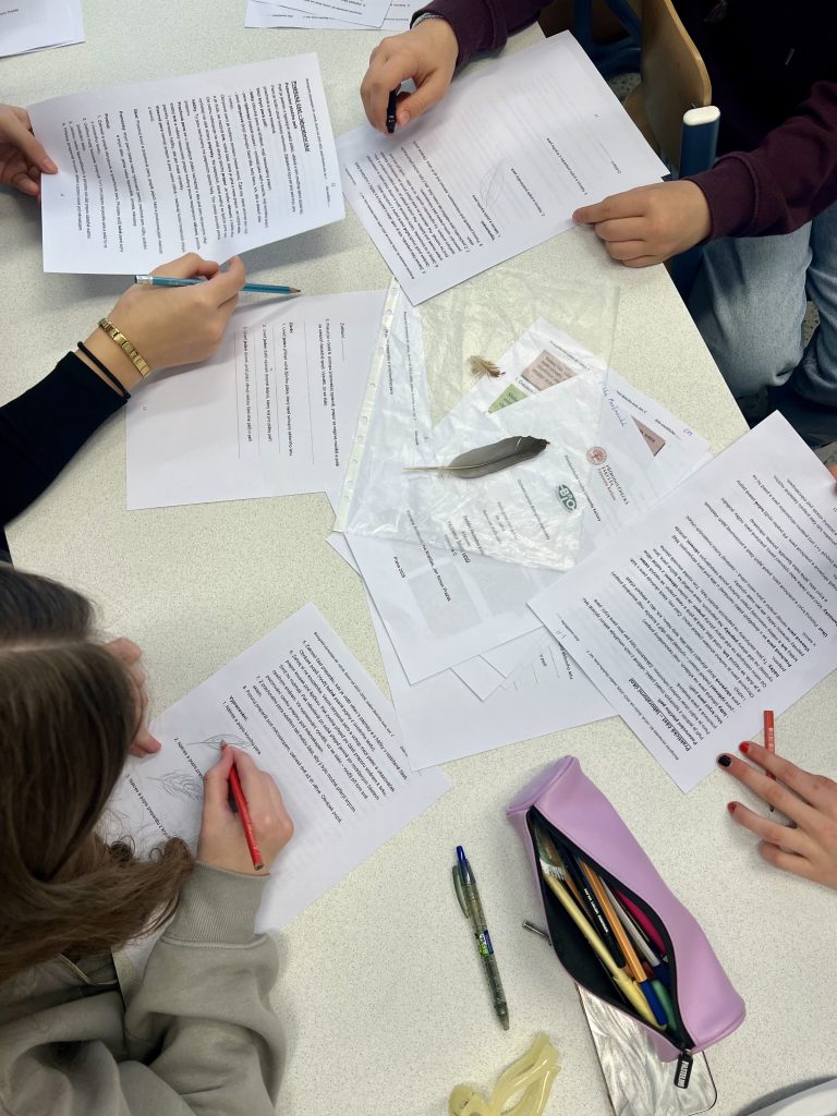 Starší žáci z osmých a devátých tříd se ponořili do světa ptáků – pozorovali různé druhy ptačích per, zakreslovali pero krycí i prachové a hledali rozdíly mezi nimi.
