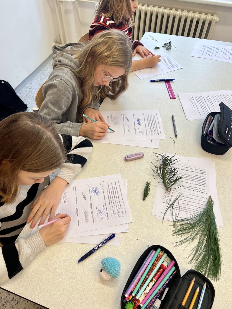 V praktické části mladší žáci zkoumali jehlice jehličnanů typických pro tajgu, porovnávali jejich délky a nenápadně si procvičili i aritmetický průměr (ano, i biolog občas počítá).