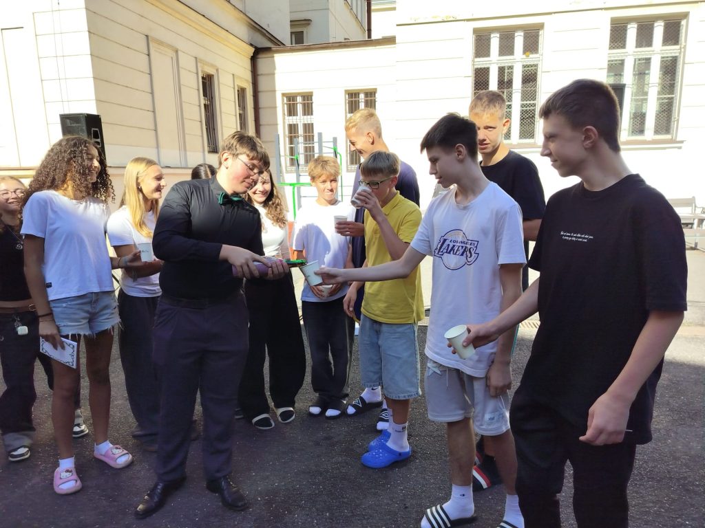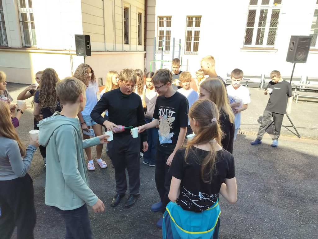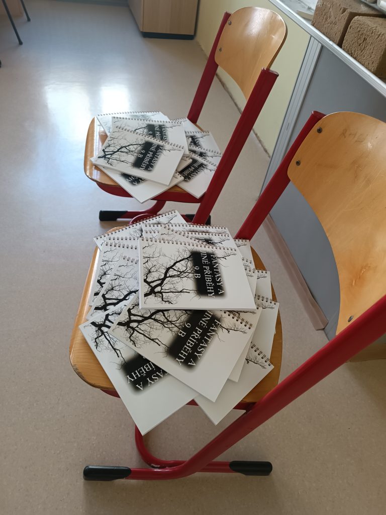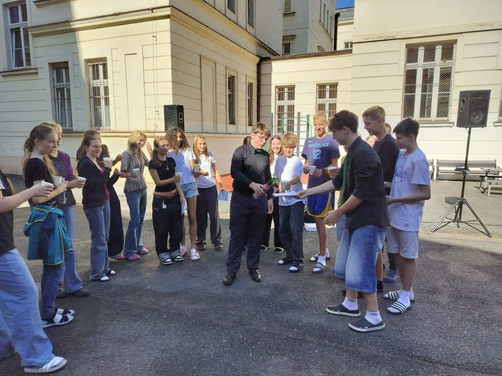 Žáci 9. A a 9. B se letos pustili do velkého projektu – společně napsali svou vlastní knihu plnou fantasy a dalších příběhů. Výsledek své práce slavnostně představili při křtu na školním dvoře. Nechybělo šampaňské, přípitek ani polévání knihy, jak se při správném křtu sluší a patří. Na slavnost se přišli podívat pan ředitel, paní zástupkyně i vybraní žáci z prvního stupně. Pro mladší spolužáky si deváťáci připravili drobné aktivity a soutěže.