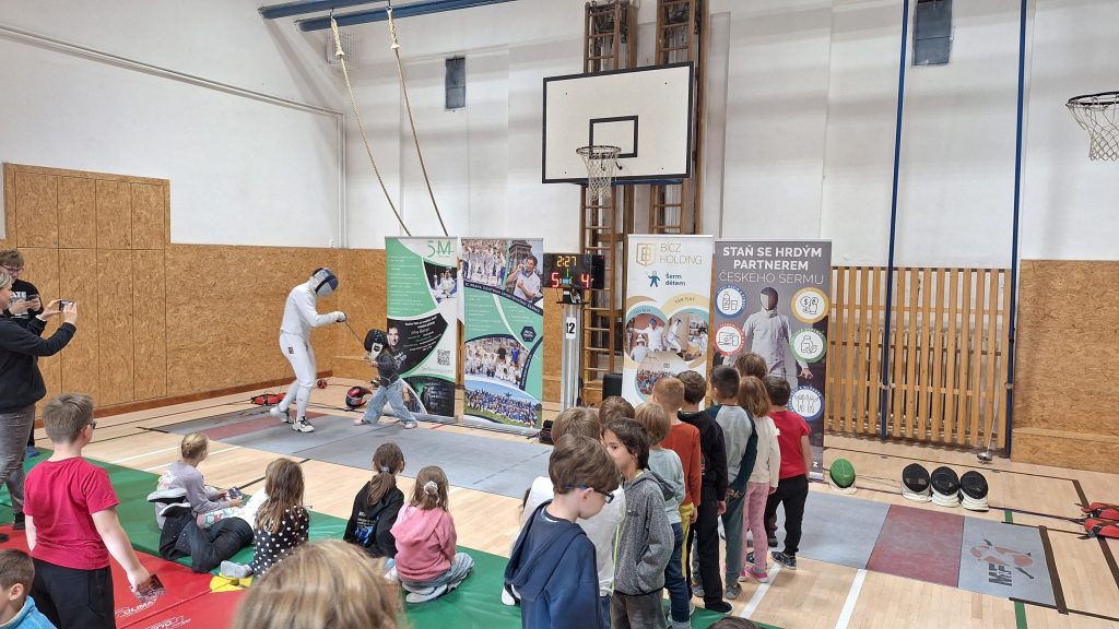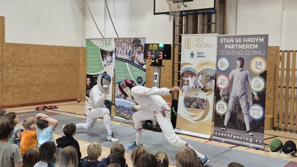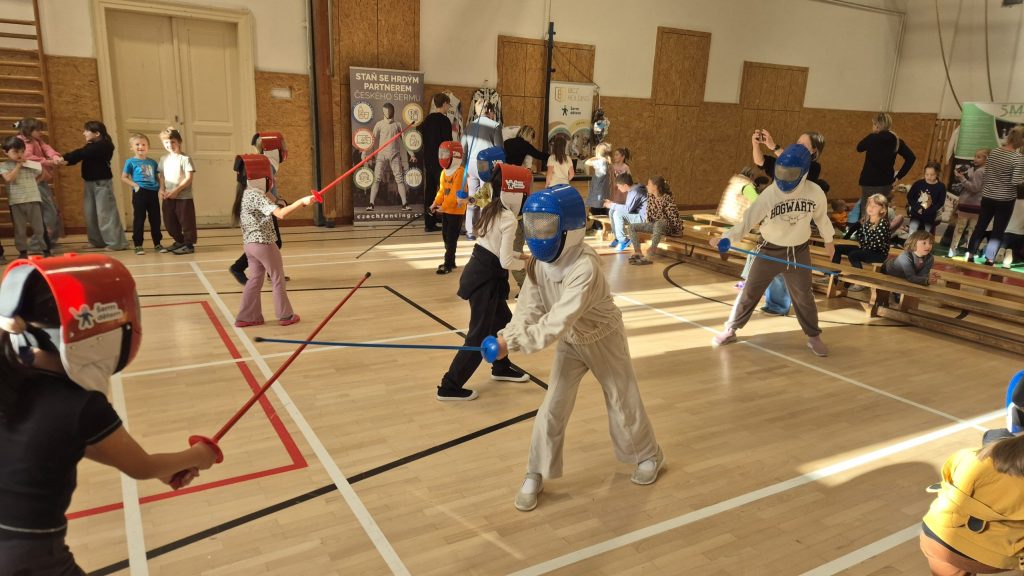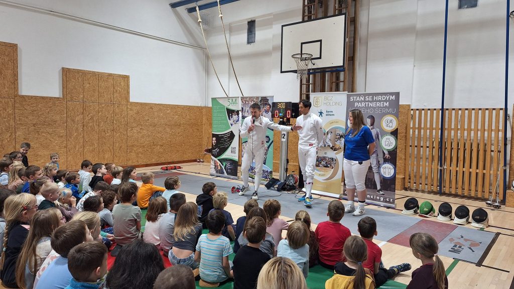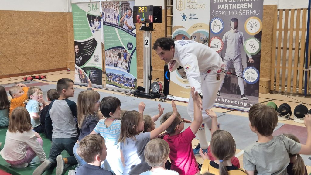 Naši školu navštívil olympijský šermíř Jiří Beran, několikanásobný mistr České republiky, účastník Olympijských her v Riu de Janeiru 2016 a držitel bronzové medaile z roku 2024 na olympiádě v Paříži. Pan Beran nám se svým týmem poutavě vyprávěl o historii šermu, o pravidlech a bezpečnosti, a poté si žáci mohli šerm vyzkoušet sami – buď mezi sebou ve dvojicích, nebo přímo s mistrem.