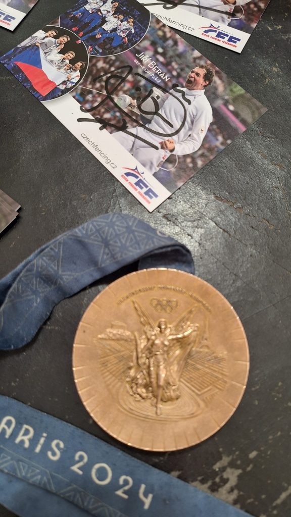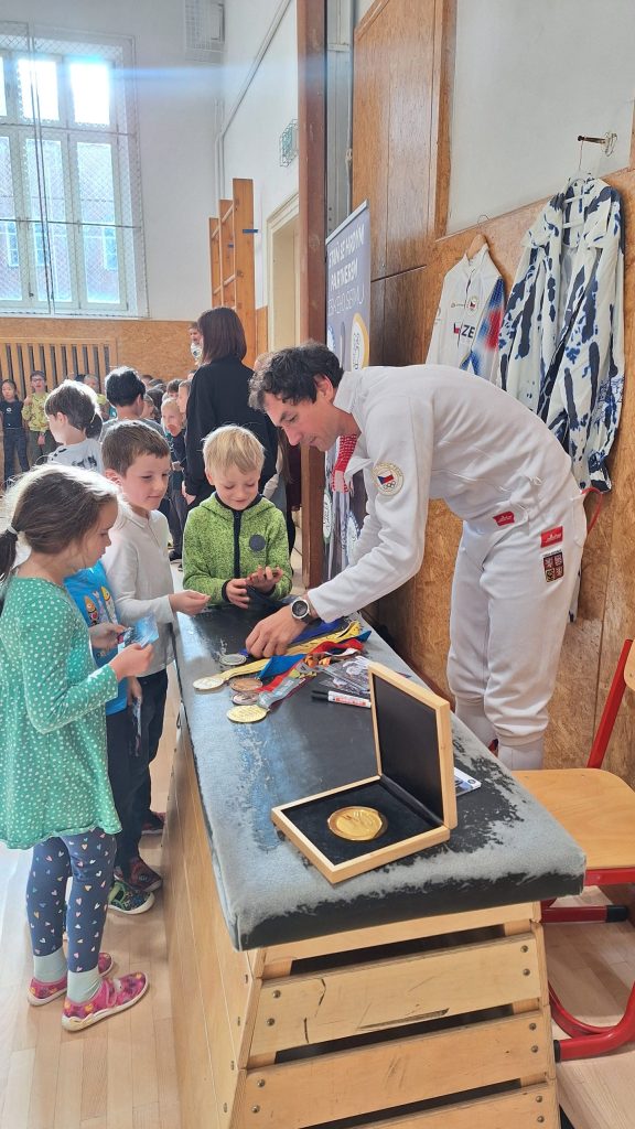 Nechyběla ani možnost potěžkat si jeho originální medaili, což byl pro všechny velký zážitek. Celkově šlo o velmi zábavný a inspirativní workshop, který žáky nadchl a přiblížil jim svět sportovního šermu zábavnou a poutavou formou.