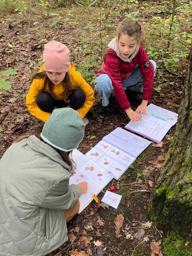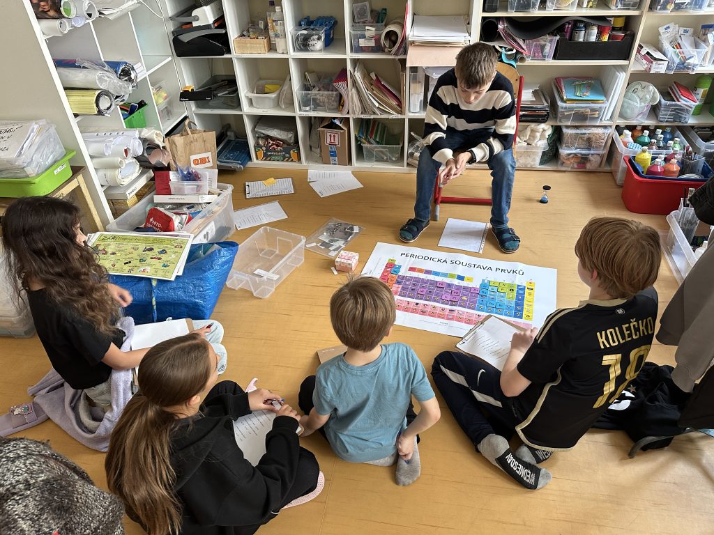 Mladší děti prozkoumávaly vesmír a přírodu – tvořily lapbooky o planetách, učily se o skupenství látek a zkoušely „výbuch sopky“. Na vycházkách do Stromovky sbíraly listy, poznávaly stromy a vytvářely z nich koláže i frotáže. Nechyběla hudba, rytmická cvičení ani hry s podzimními motivy. Závěr měsíce patřil halloweenským aktivitám, maskám mimozemšťanů a společným hrám plným fantazie.