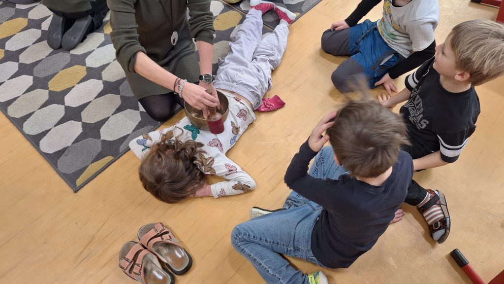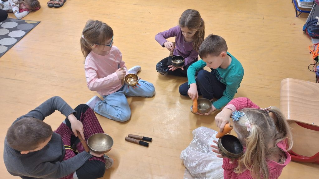 V rámci hudební výchovy se žáci 1.B zúčastnili dvouhodinového programu zaměřeného na muzikoterapii. V první části se děti hravou formou dozvěděly, že hudba je tvořena vibracemi a že lidské tělo, které je z velké části složené z vody, na tyto vibrace reaguje. Vyzkoušely si různé léčebné hudební nástroje, například tibetské mísy, kalimby nebo zvonkohry, a zaposlouchaly se do hudby laděné na 432 Hz, která podporuje relaxaci a zklidnění.