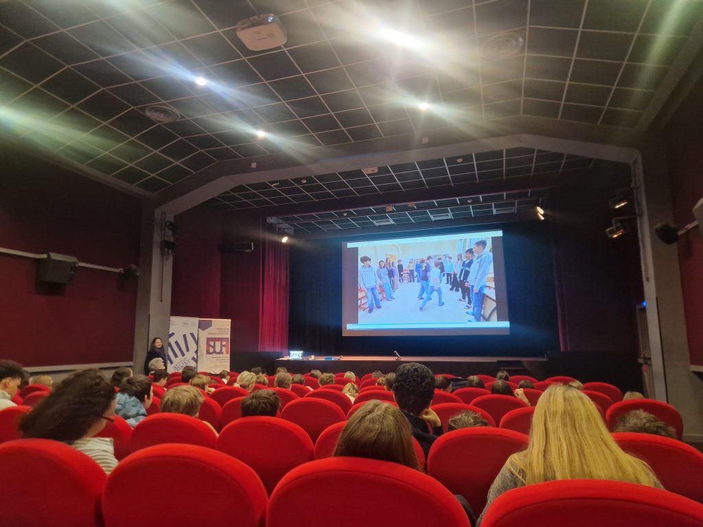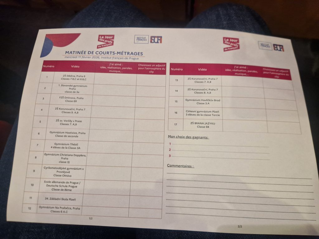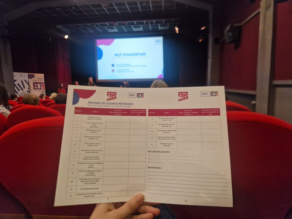 V návaznosti na účast našich francouzštinářů v soutěži – složení vlastní francouzské písničky a tvorby videoklipu, více info zde: https://www.korunka.org/francouzstinari-slozili-vlastni-pisnicku-a-natocili-videoklip/, jsme byli dne 11.2. 2026 pozváni do Francouzského kulturního institutu v Praze na promítání soutěžních videí, hlasování a vyhlášení výsledků. 3 žáci ze 7. třídy o tom napsali své svědectví. 🙂