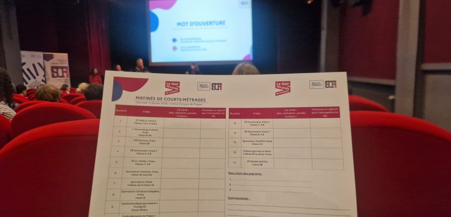 V návaznosti na účast našich francouzštinářů v soutěži – složení vlastní francouzské písničky a tvorby videoklipu, více info zde: https://www.korunka.org/francouzstinari-slozili-vlastni-pisnicku-a-natocili-videoklip/, jsme byli dne 11.2. 2026 pozváni do Francouzského kulturního institutu v Praze na promítání soutěžních videí, hlasování a vyhlášení výsledků. 3 žáci ze 7. třídy o tom napsali své svědectví. 🙂