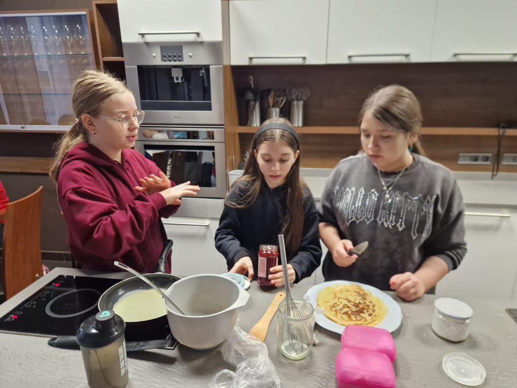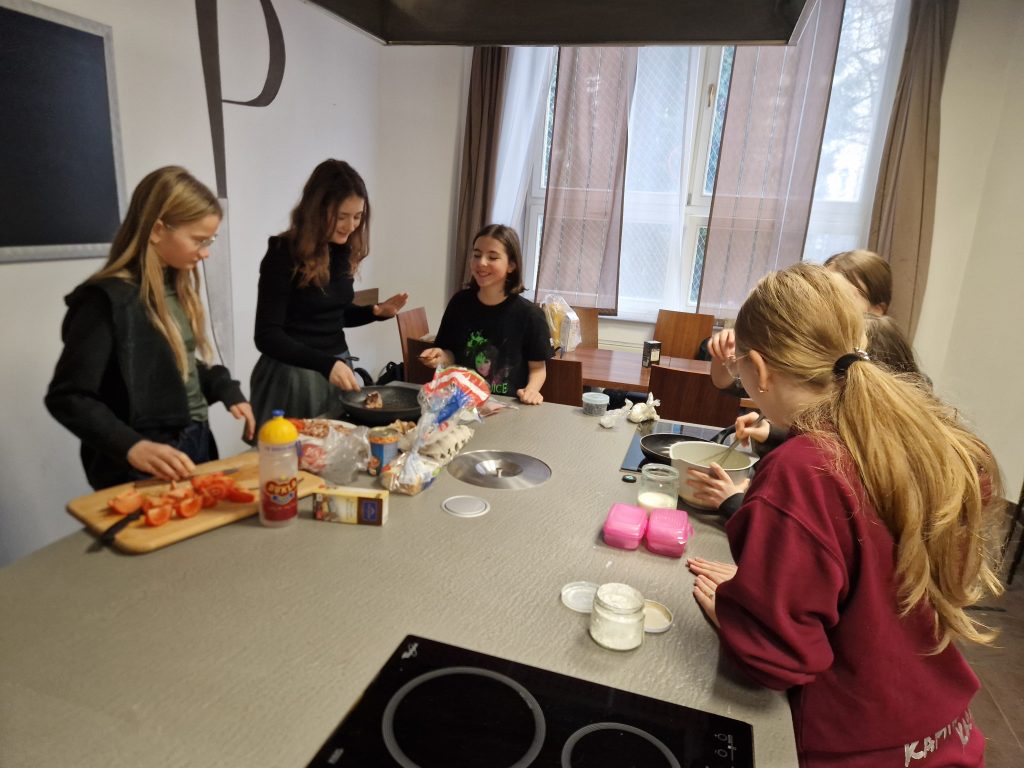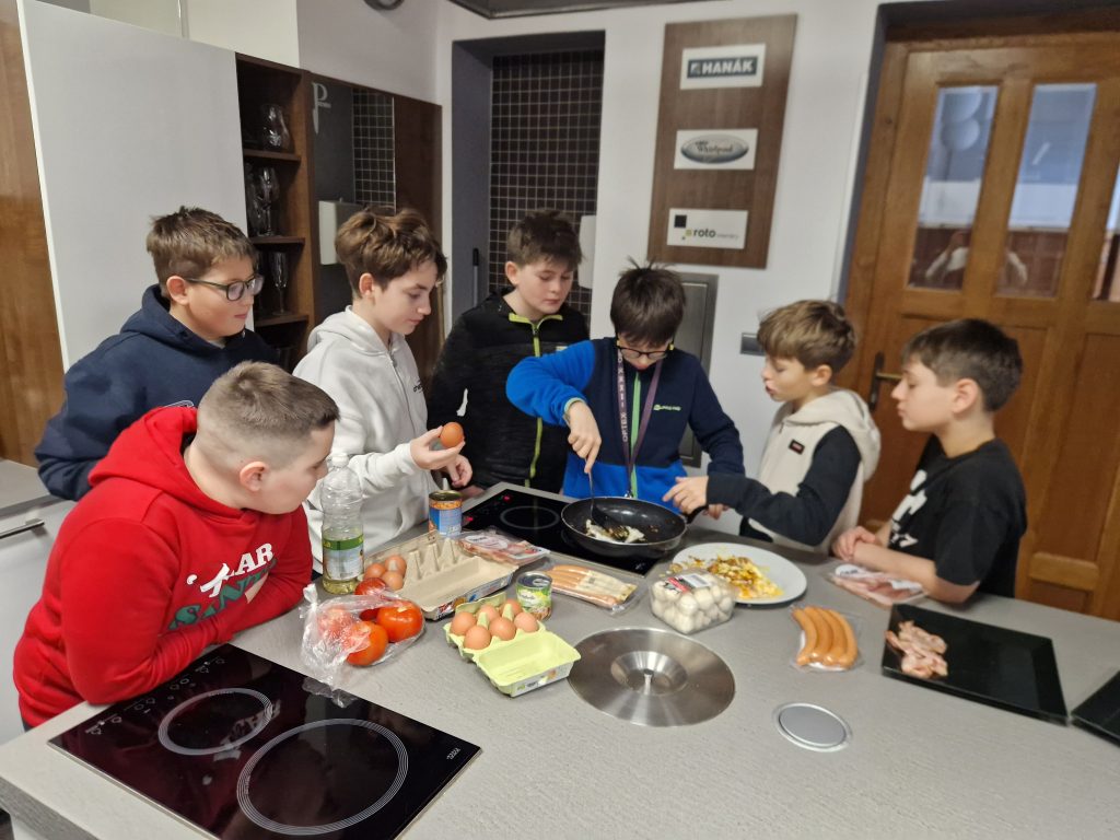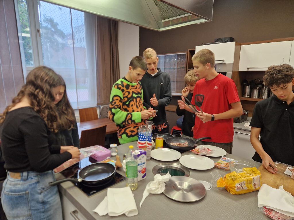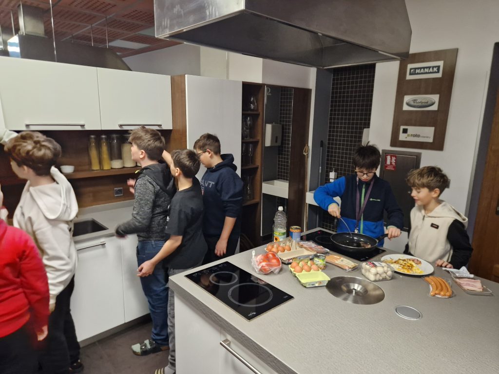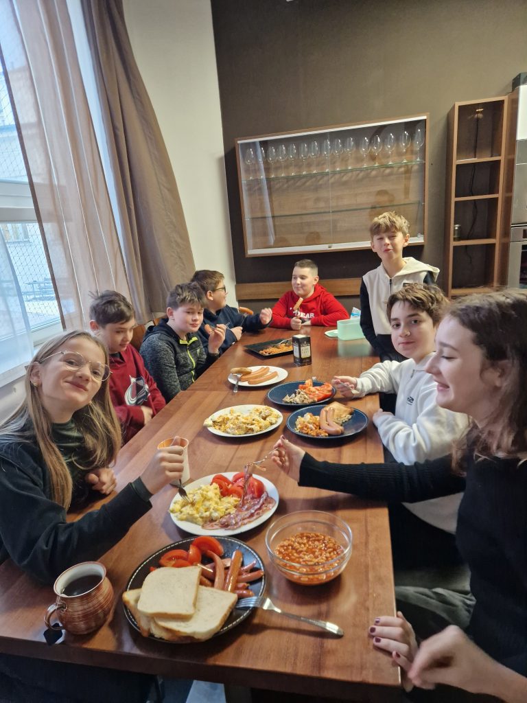 I letos jsme si s žáky 6. a 8. a 9. tříd připravili tradiční The English Breakfast. Společně jsme vařili, spolupracovali a měli jsme jen dvě pravidla: bezpečnost a mluvit pouze anglicky, jinak už bylo vše na vzájemné domluvě žáků mezi sebou. Bylo krásné sledovat, jak se s věkem zvyšuje samostatnost žáků, zatímco mladší potřebovali více podpory, starší pracovali jistěji a přirozeně přebírali odpovědnost. Nešlo jen o jídlo, ale hlavně o radost ze společné práce a učení v praxi a běžné praktické anglické mluvy. Těšíme se na další vaření v angličtině!