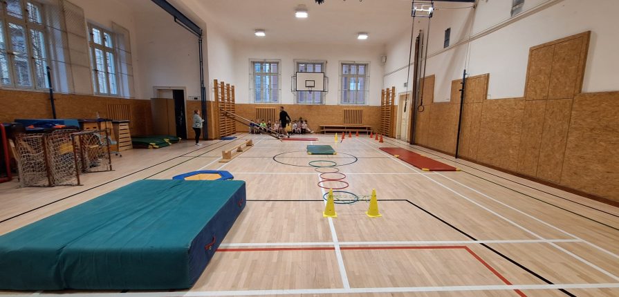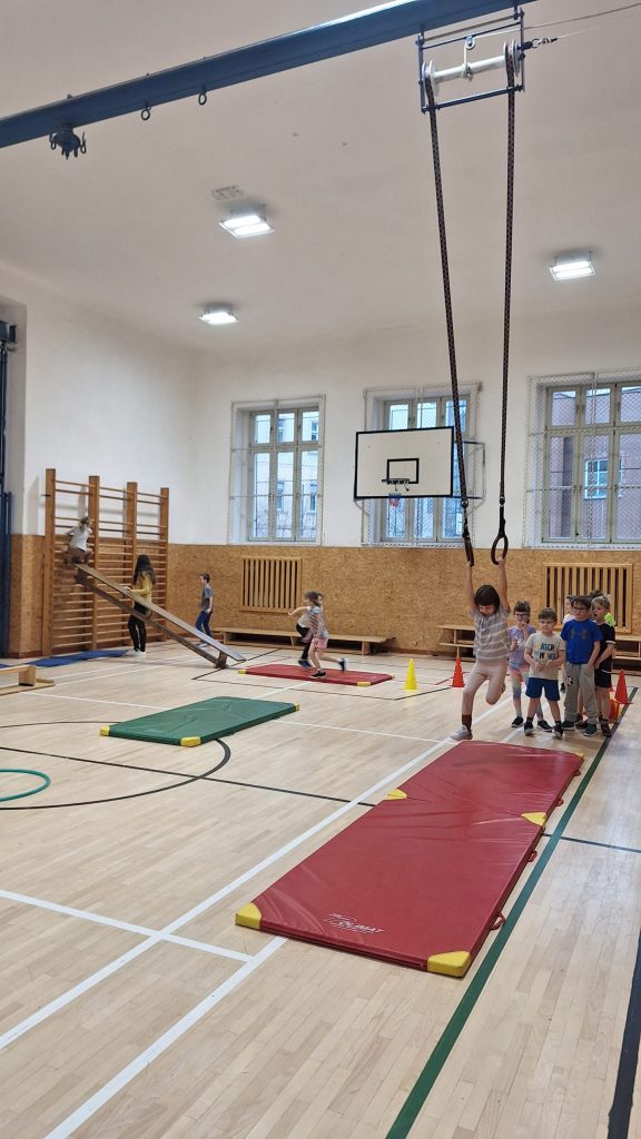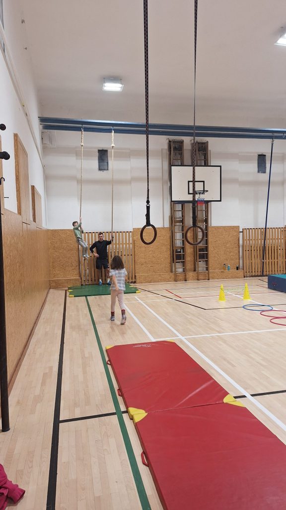 V současné době trénujeme s fotbalistou – a nezůstává jen u fotbalu. Děti si zkoušejí také základy basketbalu a cvičení zaměřená na celkovou pohybovou zdatnost. Dnešní hodina byla obzvlášť povedená: po veselých honičkách jsme si na přání dětí postavili velkou „opičí dráhu“, která měla obrovský úspěch.